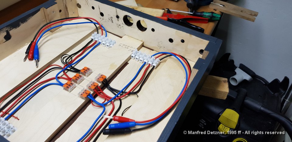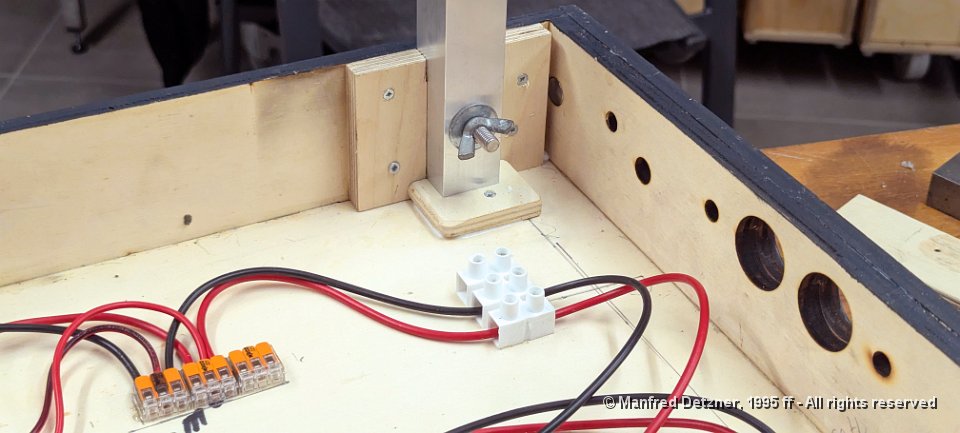 5 Das Modul ist immer noch im Rohbau. So schaut es von unten aus: Alu-Standbeine sind eingepasst, die Elektrik ist durch WAGO-Klemmen verbunden, als Kabelführung dienen ausgediente Lüsterklemmen mit großem Durchlass.