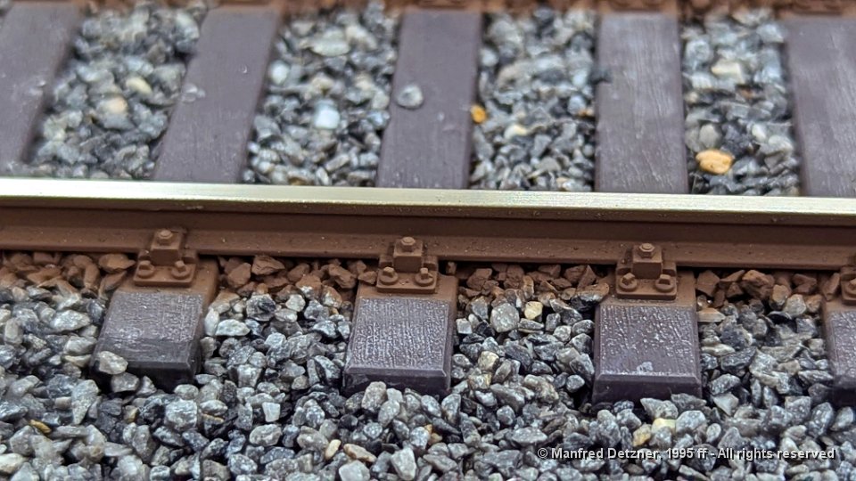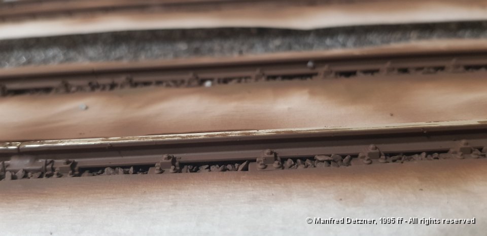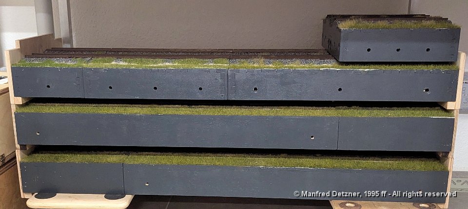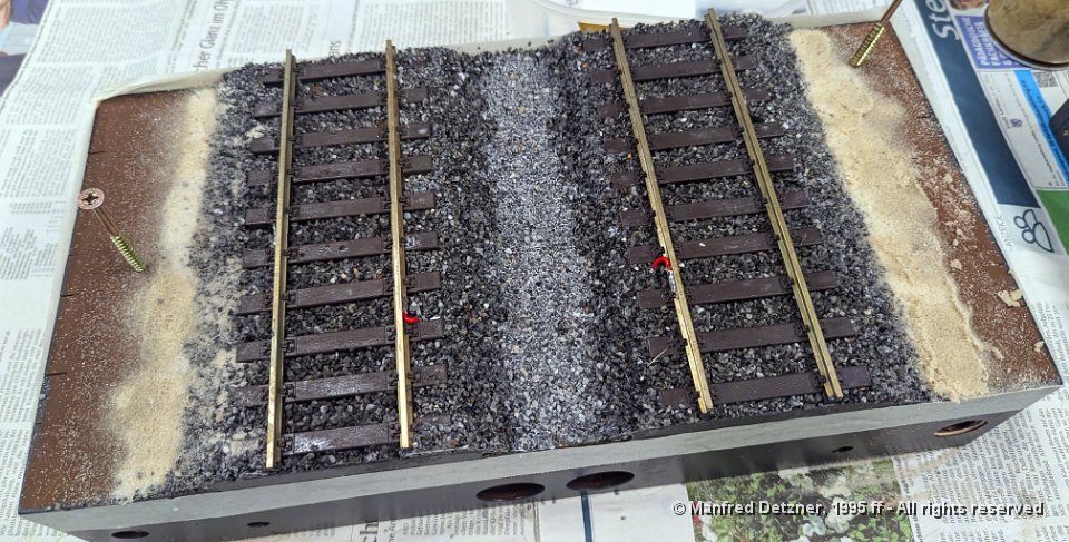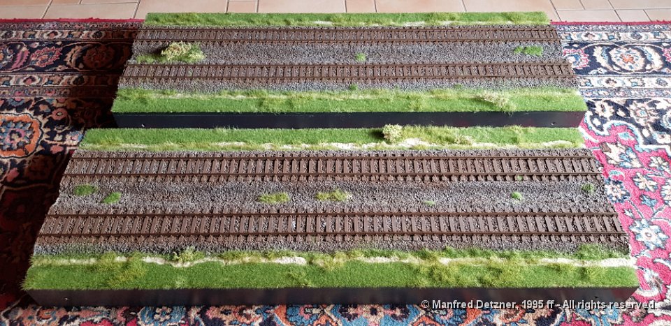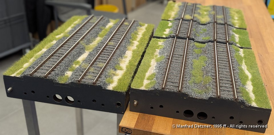 7 Auf der Oberseite des Moduls ist der Gleisbereich schwarz, alles andere braun angestrichen. Die Gleise liegen bereits, ebenso ist die Elektrik installiert. Vor der weiteren Gestaltung sollte man die Module auf elektrischen Durchgang prüfen.